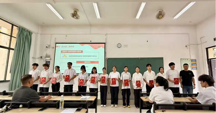 会议伊始,全体人员奏唱团歌,现场氛围庄重。随后,李凌燕宣读本学年团学干部名单,曾令伟为团学干部颁发聘书。